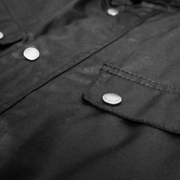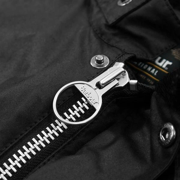 Barbour International Duke Wax Jacket – Black A mainstay of the World Tour collection, the Duke is a re-work of the iconic Enfield jacket in a winter-ready waxed cotton. With biker styling and a robust construction, the Duke is crafted in Barbour’s 6oz Thornproof wax for durable protection with a lustrous finish, complete with a two-way zip and hardy studded storm fly front. A quilted nylon lining adds warmth, while the cosy funnel collar and stud-fastening cuffs boast a contrast corduroy lining for incredible softness and a signature Barbour look. Paying homage to Barbour’s motorcycle heritage, authentic detailing includes elbow patches, four studded pockets and a collar strap. The lower bellow pockets feature a stylish pleat and are generously proportioned to carry essentials without adding bulk, while a zipped inner pocket safeguards valuables. With the Barbour International badge to the sleeve, the Duke is subtly tailored with a relaxed fit ideal for winter layering. Fit: Regular Material: 6oz Waxed Cotton Lining: 100% Polyamide Product ID: MWX0337BK91