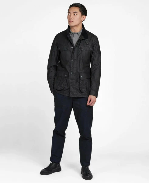 A lightweight take on the Barbour International Duke waxed cotton jacket with two angled chest pockets and two lower box pleated patch pockets. It’s got a lightweight cotton lining, a corduroy collar lining and gold toned stud fastenings throughout for a classic look. 100% waxed cotton outer 100% Cotton inner 4oz lightweight wax Barbour International badge to left arm Sponge clean only Back length: 29-33in / 74-84cm