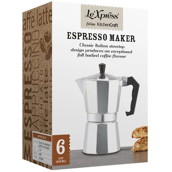Make some fresh and full-bodied espresso for you and your friends in minutes, using this classic Italian stovetop espresso maker. This time-honoured espresso maker design makes a high quality brew by forcing high pressure water through ground coffee to infuse and produce an exceptional full bodied coffee flavour. Features a long lasting high temperature silicone gasket. Size – 6 cup Capacity – 290ml Material – Aluminium Handwash only Suitable for all heat sources excluding induction