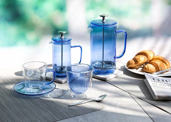 A stylish but bold Blue glass design crafted in a smooth, slightly curved shape so your coffee fits comfortably into your hand.