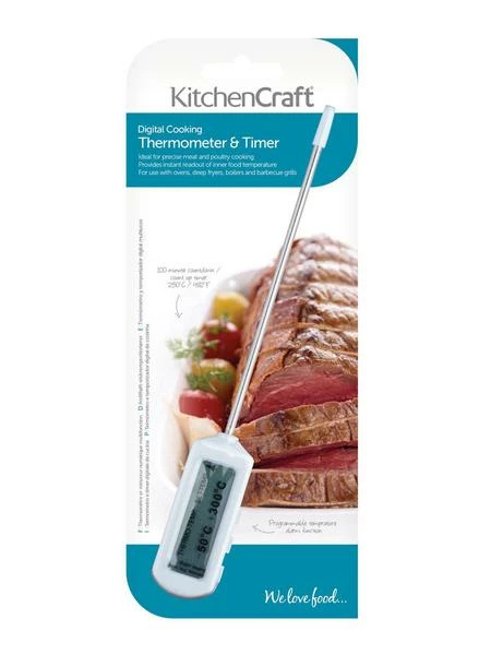 Wipe clean only Replace with battery type AG10 or equivalent 12 month guarantee Size: 22cm DO NOT PLACE OR LEAVE THIS PRODUCT INSIDE AN OVEN OR MICROWAVE OR ON A BARBECUE. THIS PRODUCT HAS BEEN DESIGNED TO TEST TEMPERATURE OF FOOD ONLY Here you’re looking at an Electronic Digital Thermometer and Timer from Kitchen Craft. Perfect for checking that your food and liquids are properly cooked or chilled, this multi purpose probe thermometer and timer is easy to use. Simply insert the probe and an alarm will sound when the required temperature has been reached. Measures temperatures from -50°C to 300°C and also features an individual 99 hour countdown alarm timer function when cooking according to time, and a clear, easy to read LCD display.