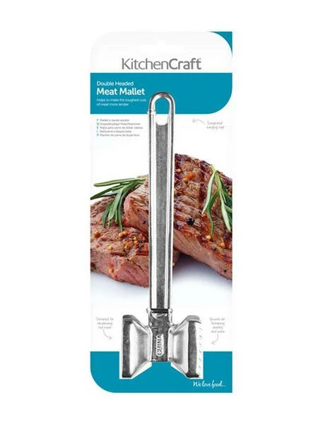 Handwash only Double headed 12 month guarantee Size: 21cm Here you’re looking at the Heavy Duty Metal Meat Tenderiser from Kitchen Craft. Make even the toughest cuts of meat more tender with this double headed meat mallet, featuring a textured side used to tenderise (ideal for red meat), and a flat side to flatten portions of meat and poultry. The mallet also includes a long handle for maximum leverage, and an integrated hanging loop for easy storage.