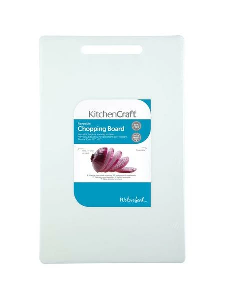 Dishwasher safe 12 month guarantee Reversible Non-toxic Size: 44cm x 30cm x 1cm (17″ x 11″) We have here the Polyethylene Chopping Board 44cm x 30cm from Kitchen Craft. Traditionally styled, this polyethylene rectangular chopping board features a cut out handle and is reversible, non-toxic, non-stick, stain resistant and gentle on knife edges.