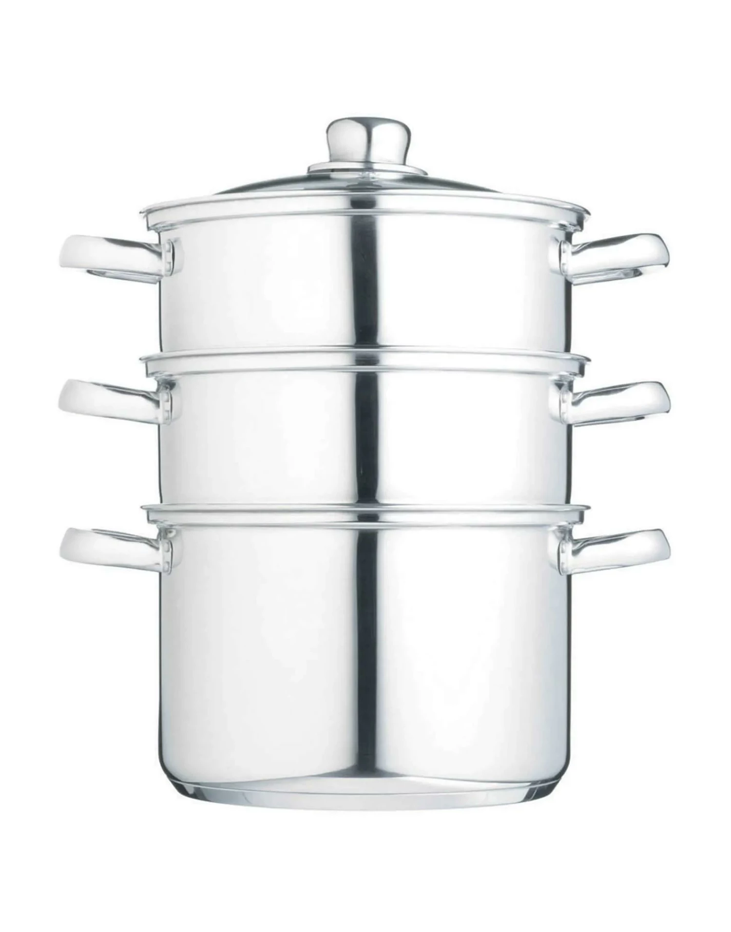 This three tier mirror-polished stainless steel steamer offers flexibility for cooking different foods at the same time or for phase cooking; to retain vitamins, minerals and flavour often lost in boiling. The steamer features a vented glass lid and wide riveted side handles.