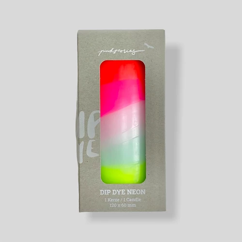 A lovingly hand-dyed neon candle by Pink Stories. Each candle is coloured by hand, so the pattern on each candle will vary, but the bright neon colour combination will remain the same. These are perfect for adding a pop of colour to any room or table; these amazing candles also have a tapered end, so they will fit any standard candle holder. Made in the beautiful foothills of the Alps with carefully selected parafin. RAL-certified. 100% Vegan Without palm oil Size: Approx. 20cm Colour: Pink, Orange, Mint Size: 50 x 100 mm