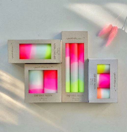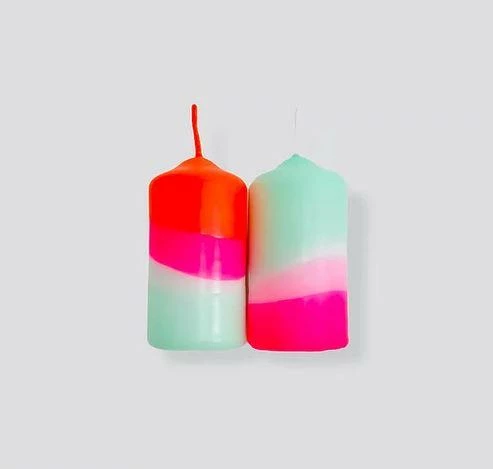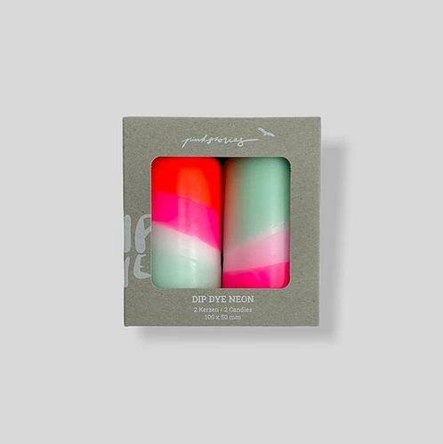 This hand dip dyed set of candles will make the perfect finishing touch to a tablescape, add colour and fun to any room décor and bring cheer when dinning inside or out. Each candle contained in the pack is unique due to the way that it has been hand dyed. Featuring beautiful bold neon tones in stunning colour combinations. Created by Pink Stories in the foothills of the Alps in Bravaria with the help of workers from a social enterprise Candles come boxed in a cardboard that can be recycled. Candles measure 5 x 10 cm, pack contains 2 candles.