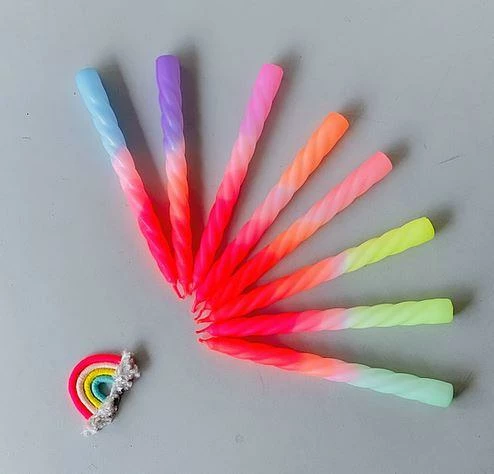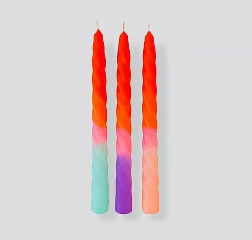 This twisted hand dip dyed set of candles will make the perfect finishing touch to a tablescape, add colour and fun to any room décor and bring cheer when dinning inside or out. Each candle contained in the pack is unique due to the way that it has been hand dyed. Featuring beautiful bold neon tones in stunning colour combinations. Created by Pink Stories in the foothills of the Alps in Bravaria with the help of workers from a social enterprise Candles come boxed in a cardboard that can be recycled. Candles measure 2.2 x 18 cm, pack contains 3 candles.