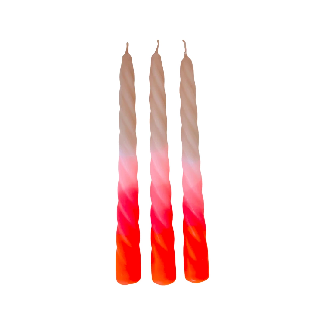 Set aus drei originellen, gedrehten Stabkerzen im Neonlook. Besonders sch�n ist hier die Kombination des zur�ckhaltenden Beigetons, der in einem Verlauf �ber Rosa zu knallogem Neon-Orange und Pink �bergeht. Die Musterverl�ufe variieren bei jeder handgef�rbten Kerze und machen sich zu einem besonderen Unikat. Die Kerzen werden in liebevoller Handarbeit in Kooperation mit einer sozialen Einrichtung aus ausgew�hltem Paraffin in Bayern hergestellt, sind RAL-zertifiziert, ru�- und emissionsarm, ohne Palm�l, 100% vegan. Abmessung: D: 23, H: 230 mm, Material: Paraffinwachs, Farbe: Pomegranate, Set aus drei St�ck Kerzen, jedes St�ck ein handgemachtes Unikat