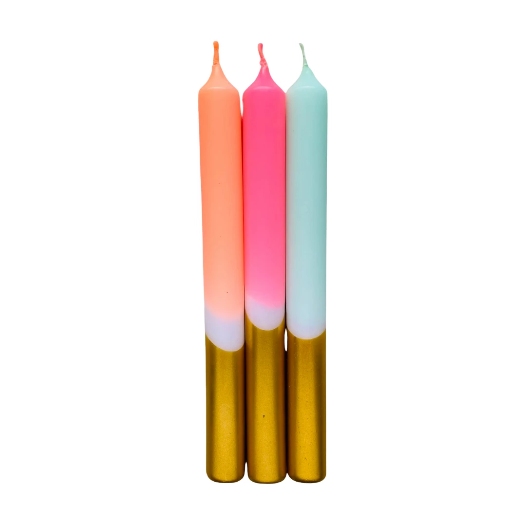 Die drei sch�nen Dip Dye-Kerzen im Goldlook sind in einem schwarzen Karton mit Sichtfenster in Form eines Tannenbaums verpackt und somit die ideale Geschenkidee. Das X-Mas Fireworks-Set enth�lt drei Kerzen in Sorbett�nen, deren Unterseite in Gold getaucht ist. Die einzigartigen Kerzen werden in Handarbeit in Kooperation mit einer sozialen Einrichtung in Bayern gef�rbt, der Farbverlauf variiert bei jedem St�ck und macht es zum Unikat. Die Kerzen bestehen aus sorgf�ltig ausgew�hltem Paraffin und sind 100% vegan. Abmessung: D: 21, H: 210 mm, Material: Paraffinwachs, Farbe: Sorbet, Gold