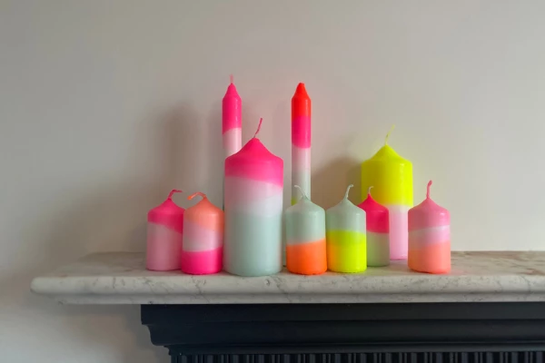 A trio of neon dip dyed dining candles. The dinner candles are lovingly hand coloured and vary from candle to candle.