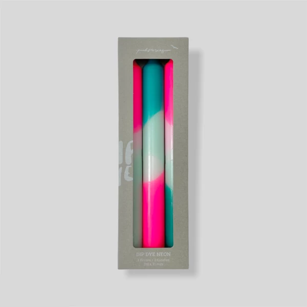 Set of three lovingly hand-colored taper candles in a neon look. The colors stay the same, the patterns vary with each candle and make them special. Dyed in cooperation with social institutions in the beautiful foothills of the Alps. Carefully selected paraffin from regional production in Bavaria. The detail… RAL certified Low soot and low emissions Without palm oil & 100% vegan 100% made in Bavaria.