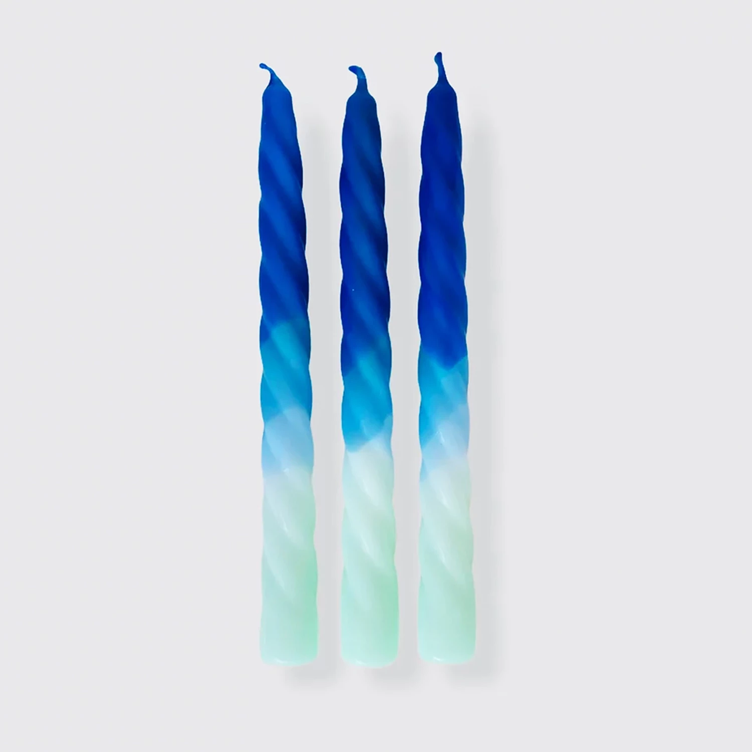 Dyed in the beautiful foothills of the Alps, this set of three twisted tapers are beautiful, a stunning hue of blues they look so refreshing.