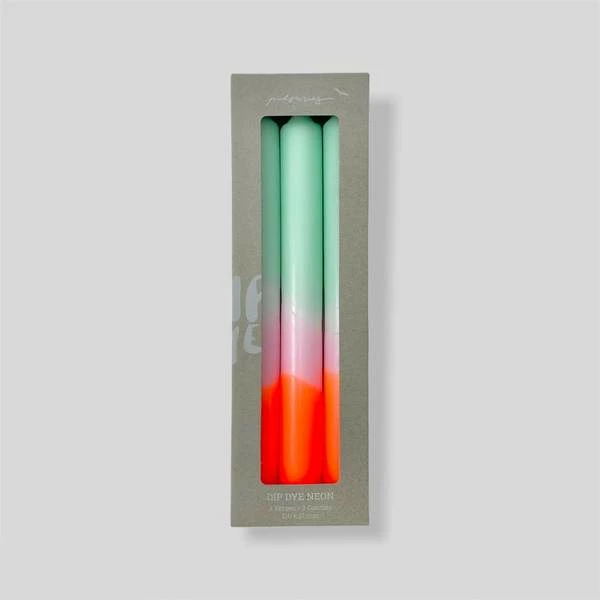 Set of three beautiful hand-dipped candles made with love.The modern neon colours give your home some fresh look. Every candle is unique.Dip-dyed in a social institution in the alpine upland of Germany using eco-certified materials. Pink Stories make their candles in the beautiful foothills of the Alps in Bavaria with the help of workers from a social enterprise. RAL certified Low soot and low emissions Without palm oil 100% vegan 100% made in Bavaria Dimensions approx. 21 x 210 mm
