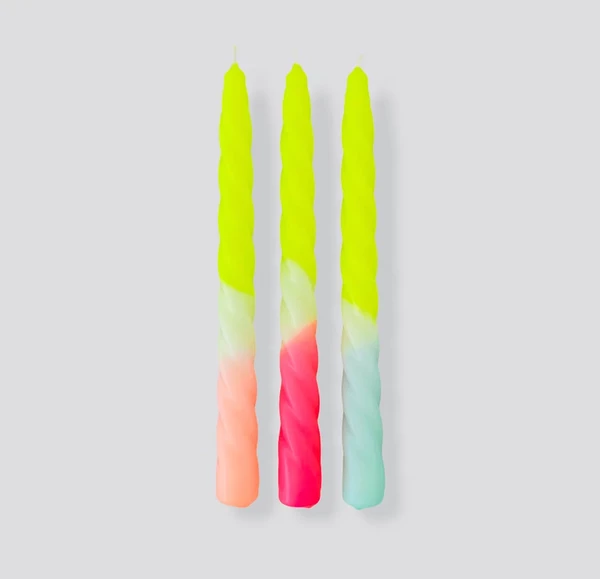 Set of three beautiful hand-dipped twisted candles made with love.The modern neon colours give your home some fresh look. Every candle is unique.Dip-dyed in a social institution in the alpine upland of Germany using eco-certified materials. Pink Stories make their candles in the beautiful foothills of the Alps in Bavaria with the help of workers from a social enterprise.RAL certifiedLow soot and low emissionsParaffin Wax/ Without palm oil100% vegan100% made in BavariaDimensionsapprox. 23cm L x 2.3cm D